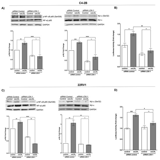 OxLDL/LOX-1 induces the activation of NF-κB in CRPC cell models. Western blot analysis of p-p65 and p-IκB-α in protein extracts of (A) C4-2B and (C) 22Rv1 cells transfected with siRNA against LOX-1 or control and treated with 50 μg/mL oxLDLs for 1 h. The NF-κB activity was analyzed using the reporter plasmid pHAGE NFKB-TA-LUC-UBC-dTomato-W in (B) C4-2B or (D) 22RV1 cells, co-transfected with siRNA control or siRNA LOX-1 and treated with 50 μg/mL oxLDLs for 24 h. The data represent the means ± S.D. of three independent experiments analyzed by one-way analysis of variance and Dunnett’s post-test (**** p ≤ 0.0001, *** p ≤ 0.001, ** p ≤ 0.01, * p ≤ 0.05, ns: non-significant statistical difference).