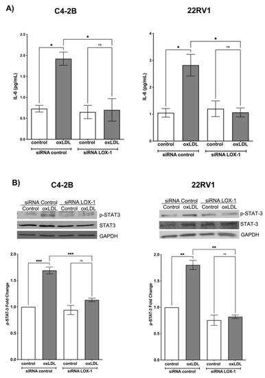 NF-κB activation significantly increases the expression and secretion of pro-inflammatory cytokines, such as IL-6, which has been described as an important cytokine in CRPC generation and enzalutamide resistance [49,50]. To determine the effect of LOX-1 activation on IL-6 secretion, C4-2B and 22RV1 cells transfected with siRNA control or siRNA LOX-1 were treated with 50 μg/mL oxLDLs for 24 h, and IL-6 levels were measured in the supernatants by ELISA. The results showed that oxLDL induces an increase in IL-6 concentration from 0.8 to 1.9 pg/m and 1.1 to 2.8 ng/mL in siRNA control C4-2B and 22Rv1 (Figure 3A). However, the effects of oxLDLs on the IL-6 secretion were prevented in the LOX-1 knockdown in C4-2B and 22RV1 cells (Figure 3A). Therefore, LOX1 activation by oxLDLs promotes the secretion of IL-6, probably through NF-κB activation in CRPC cell lines. IL-6-induced STAT3 activation partially promotes the resistance to enzalutamide in CRPC through AR and AR-V7 overexpression [51]. Given that LOX-1 activation by oxLDLs stimulated the secretion of IL-6 in our CRPC cell models, we analyzed the effect of oxLDLs on the STAT3 signaling pathway. C4-2B and 22RV1 cells were transfected with control siRNA or LOX-1 siRNA for 48 h, and then were treated with 50 μg/mL oxLDLs for 24 h, and the phosphorylation of STAT3 was determined by Western blot. The results showed that oxLDL increases STAT3 phosphorylation by 1.6- and 1.7-fold in siRNA control C4-2B and 22RV1 cells compared to untreated cells (Figure 4A). In LOX-1 knockdown in C4-2B and 22RV1 cells and the phosphorylation of STAT3 was prevented, suggesting that activation of LOX-1 by oxLDLs activates STAT3 signaling (Figure 3B).