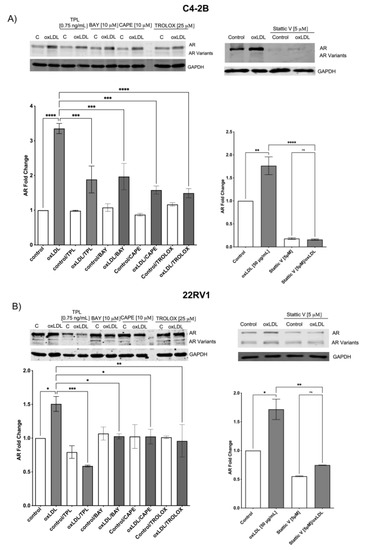 Inhibition of ROS generation, NF-κB, and STAT3 prevent oxLDL-induced AR expression. (A) C4-2B and (B) 22Rv1 cells were incubated with or without Trolox, triptolide (TLP), bay 11-7082 (BAY), caffeic acid phenethyl ester (CAPE), or Stattic (STAT3 inhibitor), then were treated with 50 μg/mL oxLDLs for 24 h and AR expression was evaluated by Western blot. The data represent the means ± S.D. of three independent experiments analyzed by one-way analysis of variance and Dunnett’s post-test (**** p ≤ 0.0001, *** p ≤ 0.001, ** p ≤ 0.01, * p ≤ 0.05, ns: non-significant statistical difference).