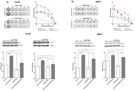 The activation of NF-κB and STAT3 signaling pathways and the overexpression of AR, AR-V7, PSA, and IL-6 have been recognized as markers and inducers or effectors (AR- AR-V7) of enzalutamide resistance in CRPC [49,57]. Our results indicate that LOX-1 activation by oxLDLs induces the axis ROS/NF-KB/IL-6/STAT3 with the consequent overexpression of AR and AR-v7. We hypothesized that the overexpression of AR and AR-V7 could decrease the cytotoxic effect of enzalutamide, an antagonist drug of AR. Our results showed that oxLDL significantly increases the surviving fraction and the IC50 for enzalutamide by 1.8- and 2.7-fold in C4-2B and 22Rv1 cells, respectively (Figure 6). Moreover, LOX-1 knockdown in C4-2B and 22Rv1 cells prevented the effects of oxLDL, even displaying increased sensitivity to enzalutamide and higher cytotoxic effect of co-treatment with oxLDL/enzalutamide (Figure 6A,B). In this regard, we observed that enzalutamide treatment for 24 h decreased AR and AR-V7 expression in C4-2B and 22RV-1; however, this effect was prevented by oxLDLs/enzalutamide co-treatments (Figure 6A,B), suggesting that the cytotoxicity-lowering effects of enzalutamide mediated by oxLDLs are mediated by the increase in the expression of classical markers of enzalutamide resistance, such as AR and AR-V7 in C4-2B and 22RV-1 cells.