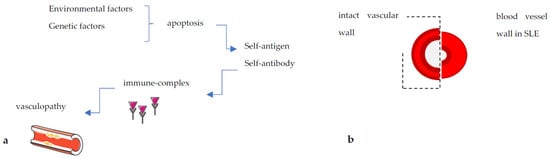 (a) Schematic pathophysiology of SLE leading to vasculopathy, including environmental and/or genetic dysregulations. (b) Vessel wall in patient with a SLE compared to the intact vascular wall.