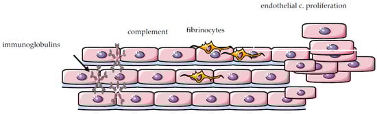 The foremost mechanism of PH development includes the functional (hypoxic) pulmonary vasoconstriction, followed by histopathological changes in pulmonary vasculature: proliferation, fibrosis and remodeling. Those histopathological features of SLE-related PH are similar to those of idiopathic PAH [], but may differ from those in scleroderma-related PAH, which is the most common cause of PAH among autoimmune rheumatic diseases. It is predominantly characterized by endothelial and smooth muscle cell proliferation, as well as fibrinoid necrosis due to vasculitis and deposition of immunoglobulins and complement components in the intimal and medial layers of the pulmonary vessels []. (Figure 1). The pathophysiological mechanisms that trigger these functional and structural changes and promote pulmonary vasculature dysfunction and eventually PH occurrence in SLE patients are divided into two main categories: