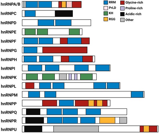 - Geuens, T.; Bouhy, D.; Timmerman, V. The hnRNP family: Insights into their role in health and disease. Hum. Genet. 2016, 135, 851–867. [Google Scholar] [CrossRef]