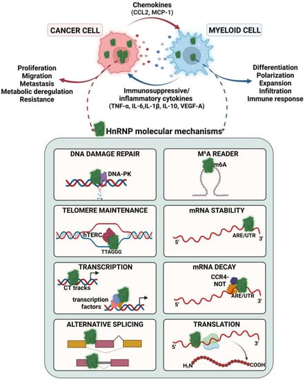 Various hnRNP-mediated molecular mechanisms regulate cancer-immune crosstalk. HnRNP increase tumor proliferation, migration, metastasis, metabolic deregulation, and therapeutic resistance. In myeloid cells, hnRNP can induce cell differentiation, polarization, expansion, infiltration, or act either as activators or repressors of the immune response. HnRNP in cancer cells regulate the production of chemokines that recruit myeloid cells into the TME. On the other hand, in myeloid cells, hnRNP control the generation of immunosuppressive or inflammatory cytokines to fuel uncontrolled tumor growth and metastasis. HnRNP-mediated effects in cancer and myeloid cells create a crosstalk, promoting a pro-tumor landscape.