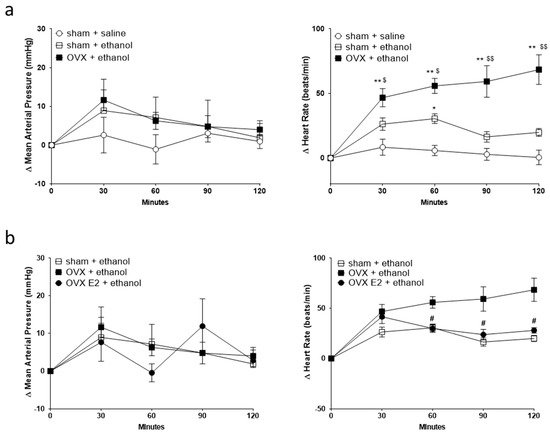 2.1. Ovariectomy Increased Ethanol-Induced Tachycardia, and Estradiol Treatment Attenuated the Tachycardia