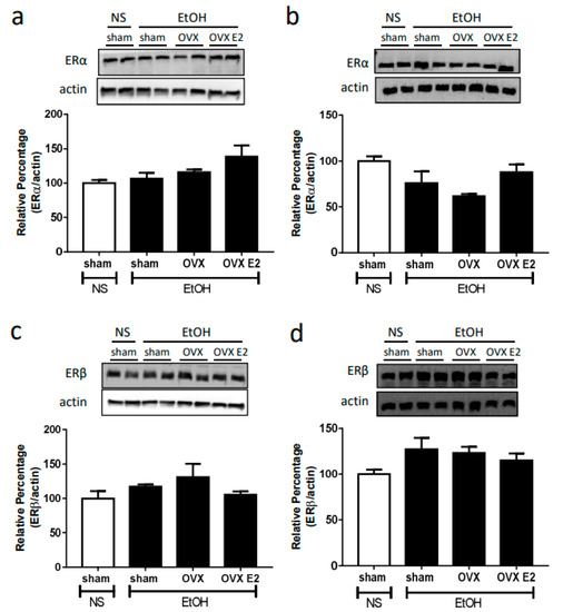 The top panels show representative western blot analysis; the bottom graphs show the percentage changes in the expression of ERα and ERβ in RVLM (a,c) and NA (b,d) at 60 min after oral gavage of normal saline (NS, 10 mL/kg) or ethanol (EtOH, 3.2 g/kg) in different treatment groups (n = 4 each). The ratio of different NOS to β-actin in the saline group is taken as a control of 100%.