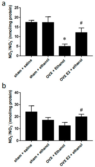 Compared to saline, oral gavage of ethanol had no significant effects on the NO levels in the RVLM and NA of the sham rats. However, the NO level was notably lower in the RVLM of the OVX group compared to that in the sham group after ethanol administration. Consequent chronic E2 subcutaneous injection reversed the NO suppression caused by OVX (Figure 4a). In the NA, the OVX group showed a lower but insignificant NO level compared to the sham group. The NO level increased in OVX rats supplied with E2 compared to that in the OVX group (Figure 4b).