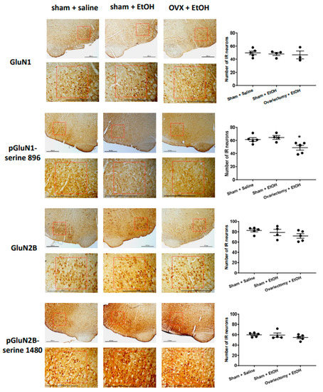 We examined the effects of ethanol on the expression of GluN1, pGluN1-serine 896, GluN2B, and pGluN2B-serine 1480 in the RVLM neurons by immunohistochemistry. Compared to saline, oral gavage of ethanol had little effect on the number of immunoreactive (IR) neurons of the subunits and phosphorylated site on the subunits in the RVLM 40 min following administration. However, the number of neurons in the RVLM area showing immunoreactivity to pGluN1-serine 896 significantly decreased in OVX groups compared to the sham rats following ethanol administration; there was no significant difference in the numbers of the IR neurons of GluN1, GluN2B, GluN2B-serine 1480 between the sham and OVX following ethanol administration (Figure 5).