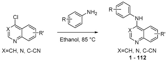 To explore the 4-anilinoquin(az)oline scaffold, we profiled seven focused arrays of compounds, probing the toxicity profile structure-activity relationships of the quinoline/quinazoline scaffold. We synthesized and screened a series of compounds (1–112) to follow up on the results of erlotinib and sapatinib, exploring the 4-anilinoquin(az)oline through a series of nucleophilic aromatic displacements of 4-chloroquin(az)olines with a series of anilines in good yields (Scheme 1) consistent with previous reports [48,49,50,51,52,53].
