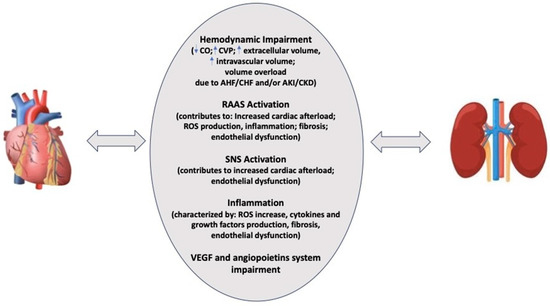 Kidney function and heart performance are interconnected by the activation of systems that modulate bidirectional and dynamic pathways [14]. However, the exact pathophysiology of CRS remains still unclear, although few mechanisms have been extensively studied, including reduced cardiac output, increased central venous and abdominal pressure, increased oxidative stress, inflammation, and activation of the renin angiotensin aldosterone system (RAAS) [15] (Figure 1).