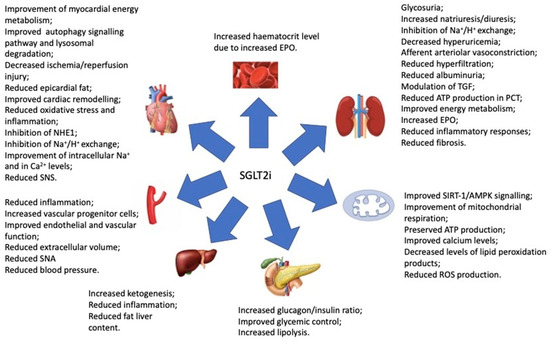 In animal models, SGLT2is have shown to reduce renal damage during ischemia–reperfusion through the inhibition of cell apoptosis in the tubule by increasing hypoxia induced factor-1 (HIF-1) and by restoring the expression of VEGFA and improving endothelial rarefaction of peritubular capillaries [178]. SGLT2i may increase the systemic oxygen availability by improving tubulointerstitial hypoxia, allowing fibroblasts to resume normal erythropoietin production and inducing the suppression of sympathetic hyperactivity, allowing cardiovascular and renal protection [179]. Moreover, the shift of metabolism from glucose and fat to ketone bodies has been hypothesized as one of the mechanisms to lower renal oxygen consumption to alleviate hypoxic stress, as well as to improve renal function and slow the progression of diabetic kidney disease [180]. Interestingly, SGLT2is activate sirtuin-1, which exert protective actions on the heart and kidneys [181] by reducing fibrosis and inflammation in renal cells and reducing hypoxic injury in cardiomyocytes. SGLT2is can also inhibit the renal reabsorption of sodium coupled-uric acid inducing the urinary excretion of uric acid. This mechanism may further contribute to slow the progression of CKD and CVD [182]. SGLT2is have been also shown to stabilize the circadian rhythms of blood pressure and the sympathetic system activation by the interaction with neural signals within the hypothalamus [183].