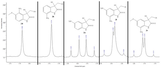 Usually, for compounds 2 and 3, the diastereotopically different CH2 protons are well resolved in 1H NMR spectra (see 2a, Figure 1). Interestingly, in the case of 7-nitro or 4-nitrosubstituted cyanooxindoles, the diastereotopy in NMR was poorly resolved up to complete degradation into singlet for compounds 2b,d (Figure 1).