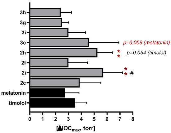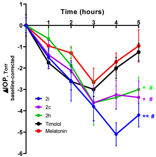 Compounds 2h and 2c, like timolol and melatonin, showed the maximum effect at 3 h and compound 2i—4 h after instillation, and all of them represent a more extended hypotensive effect than timolol and melatonin. The more significant hypotensive effects of these compounds (2c, 2h, and 2i) compared to melatonin or timolol 5 h after instillation are statistically significant (Figure 3).