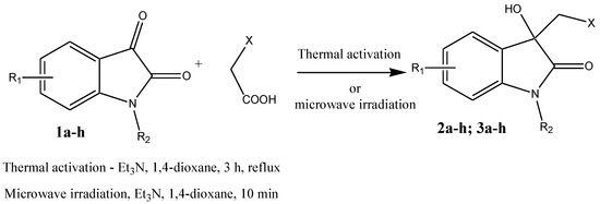 Mechanism B involves first the nucleophilic addition of malonic acid to isatin followed by decarboxylation [26]. This reaction mechanism indirectly confirms the fact that if the intensity of microwave irradiation is reduced, the product of the reaction of unsubstituted isatin 1g with malonic acid will not be 2-(3-hydroxy-2-oxoindolin-3-yl)acetic acid (3g), but 2-(3 -hydroxy-2-oxoindolin-3-yl)propanedioic acid (X) (Scheme 3).