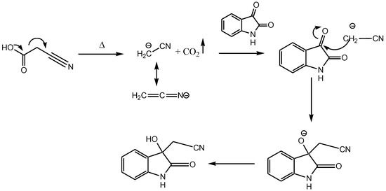- Chandran, R.; Tiwari, K.N. Krapcho Dealkoxycarbonylation Strategy of Ethyl Cyanoacetate for the Synthesis of 3-Hydroxy-3-cyanomethyl-2-oxindoles and 3,3′-Dicyanomethyl-2-oxindoles in a Reaction with Isatin. Synthesis 2020, 52, 2233–2240. [Google Scholar]