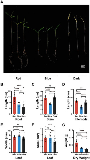 Effects of red and blue light treatments on the growth and development of moso bamboo seedlings. (A) The representative phenotypic image of moso bamboo seedlings under different light treatments. After the seeds germinated in the dark, they were transferred to red light (650 nm), blue light (450 nm) and dark conditions for 14 days. Scale bar = 3 cm. (B–G) Quantification of the root length (the length of the primary root) (B), stem length (C), internode length (the length between the second and third leaf) (D), leaf width (the width of the widest position of the second leaf) (E), leaf area (the area of the second leaf) (F), dry weight (G) of the bamboo seedlings treated with different light conditions. Data are presented as mean ± SD (n = 15 seedlings). Significant differences were analyzed by two-tailed Student’s t-test (ns p > 0.05, ** p < 0.01, *** p < 0.001, **** p < 0.0001).