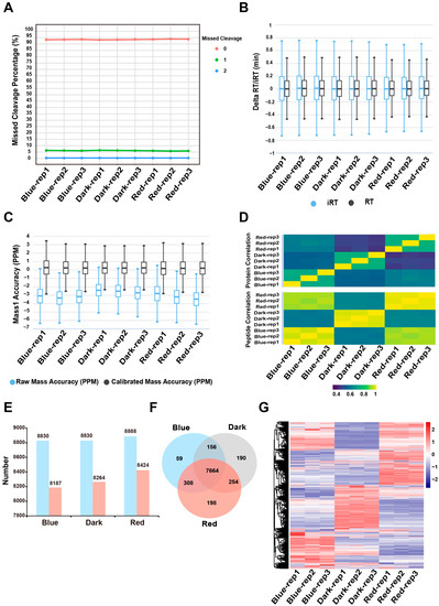 Quantitative proteomic analysis. (A) The percentage of peptides containing one (green dots), two (blue dots) or no missed cleavages (red dots) in each sample. The “rep” represents “replication”, the same as below. (B) The delta RT/iRT is the difference between a peptide theoretical and empirical RT/iRT, computed from the linear iRT/RT regression function [27]. (C) The plot of mass accuracy before and after calibration. These plots display the mass accuracy for all identified peptides at the precursor (MS1) level. The mass accuracy is calculated by dividing the (observed m/z-theoretical m/z) by the theoretical m/z (in ppm). (D) The sample correlation matrix shows correlation of peptide/protein group quantities between all samples. (E) The numbers of identified proteins and quantified proteins in the moso bamboo samples under blue light, dark light and red light conditions. The blue bar represents the number of identified proteins. The red bar represents the number of quantified proteins (the proteins identified by all three replicates). (F) Venn diagram showing the specific quantified and shared quantified proteins of the moso bamboo seedlings under different light conditions. (G) Heat map of expression profiles for the shared quantified proteins in moso bamboo seedlings under different light conditions.