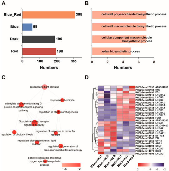 Gene ontology analyses of moso bamboo proteins under red light and blue light conditions. (A) The number of specific quantified proteins in moso bamboo under different light conditions. Blue_Red represents the group of proteins identified under red and blue light, but not in the dark. (B) Gene ontology (GO) enrichment analysis of the red light-specific quantified proteins. (C) Interactive graph of the gene ontology enrichment analysis of the proteins in Blue_Red in (A). The color of the bubble corresponds to the Log10 (FDR value of the GO term). The size of the bubble corresponds to the Log10 (number of annotations for the GO term ID in selected species in the EBI GOA database). (D) The heatmap showing the expression levels of specific quantified light stimulated proteins in Blue-Red.