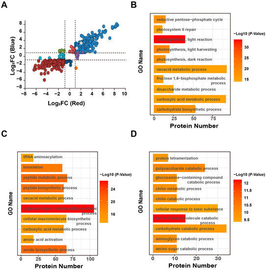 Differences in protein expression in moso bamboo under red and blue light treatments. (A) Scatter plot showing the association between the blue light-responsive proteins and the red light-responsive proteins in moso bamboo. The dashed lines indicate Log2 (FC) = ±1. The steel blue and dark red plots indicated the co-upregulated/downregulated proteins under red and blue light treatments. Green and orange plots indicated the proteins regulated in the opposite direction between red and blue light treatments. Red and navy plots indicated the proteins upregulated/downregulated under blue light and unchanged under red light. Purple and cyan plots indicated the proteins upregulated/downregulated under red light and unchanged under blue light. Gray plots indicated the proteins with p value > 0.01. (B) GO enrichment analysis of the blue and red light co-responsive proteins shown in (A). (C) GO enrichment analysis of the blue light-specific responsive proteins shown in (A). (D) GO enrichment analysis of the red light-specific responsive proteins shown in (A).