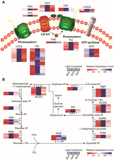 Differences in the regulation of photosynthesis-related proteins in moso bamboo seedlings under blue and red light. (A) Expression differences in the photosynthesis KEGG pathway-related DEPs in moso bamboo seedlings under different light treatments. (B) Expression differences in the carbon fixation in photosynthetic organism pathway-related DEPs under different light treatments. The arrows indicate the direction of substrate transformation. Heat maps were used to indicate the expression levels of the DEGs encoding the enzymes. (EC:4.1.1.39), ribulose-bisphosphate carboxylase large chain; (EC:2.7.2.3), phosphoglycerate kinase; (EC:1.2.1.13), glyceraldehyde-3-phosphate dehydrogenase (NADP+); (EC:4.1.2.13), fructose-bisphosphate aldolase, class I; (EC:3.1.3.11), fructose-1,6-bisphosphatase I; (EC:2.2.1.1), transketolase; (EC:3.1.3.37), sedoheptulose-1,7-bisphosphatase; (EC:5.3.1.6), ribose 5-phosphate isomerase A; (EC:2.7.1.19), phosphoribulokinase; (EC:5.3.1.1), triosephosphate isomerase (TIM).