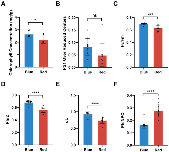 Comparison of chlorophyll content and fluorescence kinetic parameters of moso bamboo seedlings under red and blue light. (A–F) Chlorophyll concentrations (A), PS1 over reduced centers (B), Fv/Fm (C), Phi2 (D), qL (E) and PhiNPQ (F) for moso bamboo seedlings under different light treatments. Data are presented as mean ± SD (n = 10 biological replicates). Significant differences were analyzed by two-tailed Student’s t-test (ns p > 0.05, * p < 0.05, *** p < 0.001, **** p < 0.0001).