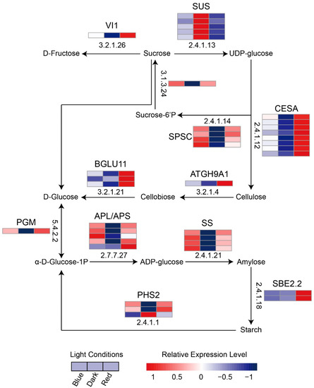 Expression differences in the starch and sucrose metabolic KEGG pathway-related DEPs of moso bamboo seedlings under different light treatments. The arrows indicate the direction of substrate transformation. The numbers in the boxes represent the EC numbers of the enzymes involved in the reactions. Heat maps were used to indicate the expression levels of the DEPs encoding the enzymes. (EC:3.2.1.26), beta-fructofuranosidase; (EC:2.4.1.13), sucrose synthase; (EC:2.4.1.12), cellulose synthase (UDP-forming); (EC:3.2.1.4), endoglucanase; (EC:3.2.1.21), beta-glucosidase; (EC:5.4.2.2), phosphoglucomutase; (EC:2.7.7.27), glucose-1-phosphate adenylyltransferase; (EC:2.4.1.21), starch synthase; (EC:2.4.1.18), 1,4-alpha-glucan branching enzyme; (EC:2.4.1.1), glycogen phosphorylase; (EC:2.4.1.14), sucrose-phosphate synthase; (EC:3.1.3.24), sucrose-6-phosphatase.