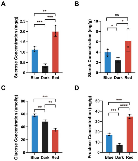 We then compared the content of soluble sugars and starch in moso bamboo seedlings under blue light, red light and darkness. The results showed that the sucrose content was significantly higher under red light than under blue light and significantly higher under blue light than under darkness (Figure 8A). The amount of starch under both blue and red light was significantly higher than the amount of starch in the dark, and there was no significant difference in the amount of starch under blue and red light (Figure 8B). Glucose content was significantly higher under blue light than in the dark and significantly higher in the dark than under red light (Figure 8C). Fructose content was significantly higher under red light than under blue light and significantly higher under blue light than under darkness (Figure 8D). Although the glucose content of bamboo shoots under red light was the lowest compared to that under other treatments, the total soluble sugar content of bamboo shoots under red light was the highest (Figure S8). These results indicate that red light more strongly promotes the accumulation of sucrose, starch and fructose than blue light in moso bamboo. However, blue light more strongly promotes the deposition of glucose in moso bamboo.