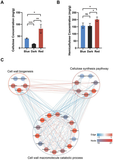 Compared to blue light, red light promotes the formation of cell wall components in moso bamboo seedlings. (A,B) Cellulose (A) and hemicellulose (B) contents of moso bamboo seedlings under different light conditions. Data are presented as mean ± SD (n = 3 biological replicates). Significant differences were analyzed by two-tailed Student’s t-test (ns p > 0.05, * p < 0.05, ** p < 0.01, *** p < 0.001). (C) Correlation analysis of DEP expression levels between cell wall biogenesis, cell wall macromolecule catabolic process and cellulose synthesis pathways. The color of the node indicates the number of proteins with co-expression relationships (from left to right, the color bar indicates the number of proteins increases in turn), and the connecting lines indicate a significant co-expression relationship between the two connected proteins. The color of the line connecting two proteins is used to indicate the correlation between the proteins. The color of the line is between 0 and 1, indicating that there is a positive correlation between the two proteins. Contrarily, it shows that there is a negative correlation between the two proteins.