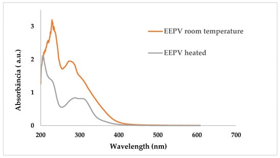 As shown in Figure 1, the absorption spectra of EEPV room temperature and EEPV heated in solution exhibited absorbance in the UVC, UVB and UVA region, with absorption maxima at around 230 nm (UVC) and 300 nm (UVB and UVA), recommending that they are potential candidates for UV photoprotection.