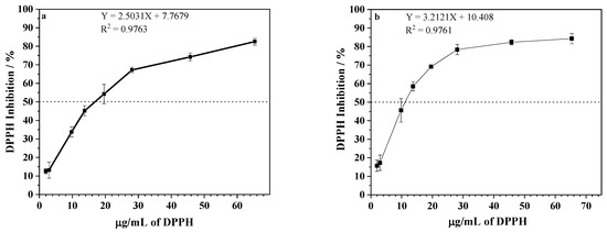 DPPH inhibition (%) after incubation with different propolis concentrations of EEPV (2.0–65.3 μg/mL) extracted at: (a) room temperature, and (b) a temperature of 70 °C. Data represent mean ± SD of 3 independent assays in duplicate. The dashed line indicates the concentration of propolis that inhibited 50% of DPPH. IC50 was calculated from the calibration curve determined by linear regression.