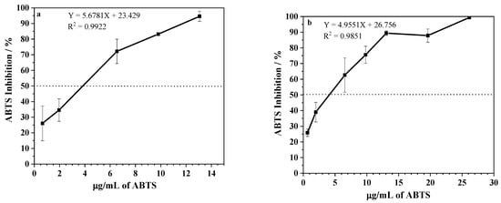 ABTS inhibition (%) after incubation with different concentrations of EEPV (0.6–26 μg/mL) extracted at: (a) room temperature, and (b) a temperature of 70 °C. Data represent mean ± SD of 3 independent assays. The dashed line indicates the concentration of propolis that inhibited 50% of DPPH. IC50 was calculated from the calibration curve determined by linear regression.