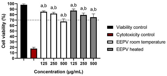 Cell viability in RAW 264.7 cells exposed to different concentrations of EEPV room temperature and EEPV heated (125, 250 and 500 μg/mL) at 24 h. Results represent the mean ± SD of triplicates of the experiments; (a) denotes a significant difference compared to the viability control (p ≤ 0.05); (b) denotes a significant difference in relation to the cytotoxicity control (DMSO 50%) (p ≤ 0.05), as determined by one-way ANOVA followed by a Dunnett’s post-test.