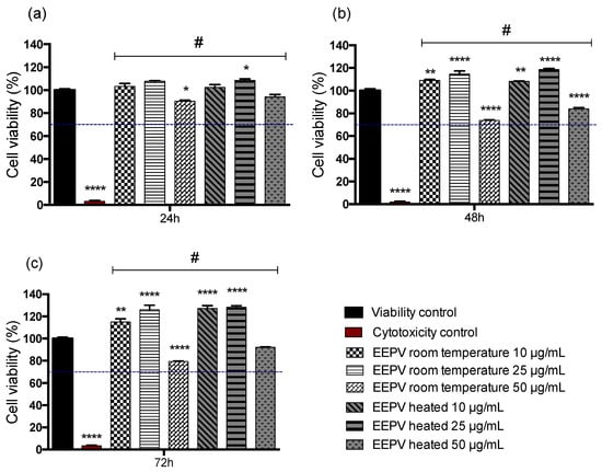 The MTT assay was employed to evaluate the cell viability of HaCaT cells exposed to different concentrations (10, 25 and 50 μg/mL) of room temperature and heated suspensions of EEPV at (a) 24, (b) 48 and (c) 72 h. The mean cell viability was normalized to that of the control group, which was exposed to PBS. A cytotoxicity control group exposed to 0.05% v/v Triton™ X-100 was also used. The error bars represent ± SEM, and statistical significance was indicated by * for p ≤ 0.05, ** for p ≤ 0.01, and **** for p ≤ 0.0001 compared to the Viability control. In addition, # was used for p < 0.0001 compared to the Cytotoxicity control. The statistical analysis was conducted using one-way ANOVA followed by a Tukey post-test.
