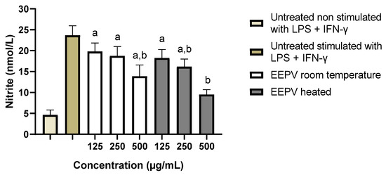 Nitric oxide (NO) production in RAW 264.7 cells after exposure to three different doses of EEPV at room temperature and EEPV heated (125, 250 and 500 μg/mL) for 24 h. The following controls were included in this assay: (positive control) untreated and non-stimulated with LPS + IFN-γ, (negative control) untreated macrophages stimulated with LPS + IFN-γ. Each bar shows the mean ± SD of triplicates of experiments. (a) denotes a significant difference in relation to the untreated control and not stimulated with LPS + IFN-y (p ≤ 0.05); (b) denotes a significant difference compared to untreated control and stimulated with LPS + IFN-y (p ≤ 0.05), as determined by one-way ANOVA followed by a Dunnett’s post-test.