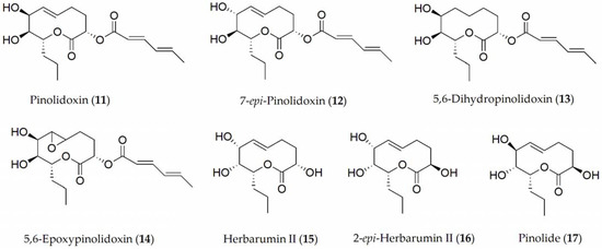 | 5,6-Epoxypinolidoxin (14) | [43,44] | |||