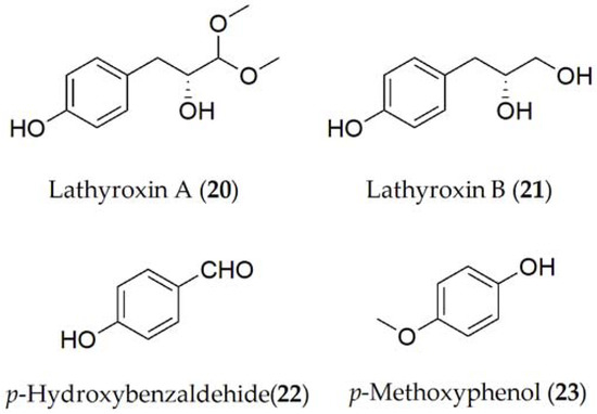 | Ascochyta lentis var. lathyri | Grass pea (Lathyrus sativus) | Ascochyta blight | Lathyroxin A (20) | [22] |