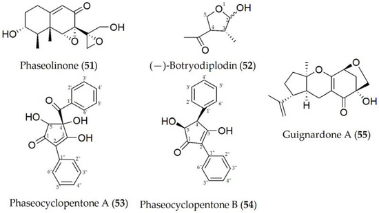 | Macrophomina phaseolina | Soybean (Glycine max) | Charcoal rot | Phaseolinone (51) | [55] |