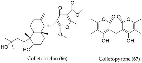 | Colletotrichum truncatum | Soybean (Glycine max) | Anthracnose | Colletruncoic acid methyl ester (56) | [58,59] |