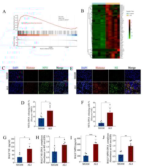 NETs are increased in mice with LPS-induced acute lung injury. Lungs from the ALI model and control were obtained to perform RNA-seq analysis. (A) Enrichment plot of the neutrophil extracellular trap formation signaling pathway from GSEA comparing ALI vs. control. (B) Heatmap showing the core genes enriched in GSEA in the neutrophil extracellular trap formation signaling pathway. The abscissa indicates the sample number, the ordinate indicates the differentially expressed genes, the right histogram indicates the color scale and each rectangle in the panel corresponds to an expression value in one sample. (C) Representative images of immunofluorescence co-localization of histone and MPO (scale bar = 200 µm). (D) The percentage of NET-DNA (histone + MPO)-releasing cells. (E) Representative images of immunofluorescence co-localization of histone and NE (scale bar = 200 µm). (F) The percentage of NET-DNA (histone + NE)-releasing cells. (G) NE, (H) NE-DNA, (I) MPO and (J) MPO-DNA concentrations in BALF. GSEA = gene set enrichment analysis; ES = enrichment score; NES = normalized enrichment score; ALI = acute lung injury. Data are presented as the mean ± SD, n = 6 per group, * p < 0.05, ** p < 0.01, *** p < 0.001. Comparisons between two groups were analyzed by an unpaired t test.