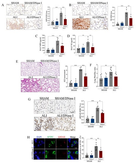 Pharmacological degradation of NETs confers protection against LPS-induced acute lung injury. NET inhibitor DNase I (20 mg/kg) was intravenously injected 1 h after LPS treatment. (A) Representative images of the immunohistochemical staining of MPO (scale bar = 500 µm), and statistics of the positive signal of MPO in lung tissue. (B) Representative images of immunohistochemical staining of NE (scale bar = 500 µm), and statistics of the positive signal of NE in lung tissue. (C) Concentration of MPO in BALF. (D) Concentration of NE in BALF. (E) Representative images of H&E staining of lung tissue (X100), and ALI assessment score. (F) Lung wet weight-to-dry weight ratio. (G) Representative images of immunohistochemical staining of γH2AX in lung tissue (scale bar = 500 µm), and statistics of the positive signal of γH2AX in lung tissue. (H) Representative images of immunofluorescence co-localization of SFTPC and γH2AX (scale bar = 2 µm), and the percentage of γH2AX-positive SFTPC+ cells. Data are presented as the mean ± SD, n = 6–8 per group. * p < 0.05, ** p < 0.01, *** p < 0.001. Comparisons between two groups were analyzed by an unpaired t test; otherwise, one-way analysis of variance was performed, and Tukey’s test was used to perform pairwise comparisons.