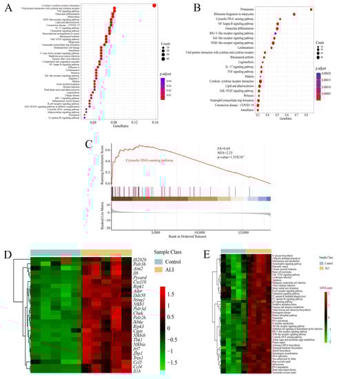 RNA-seq analysis suggests that the cytosolic DNA sensing pathway is up-regulated in acute lung injury. Lungs from the ALI model and control were obtained to perform RNA-seq analysis. (A) Bubble chart of KEGG enrichment analysis for significantly up-regulated genes in ALI (log2 foldchange > 2 and adjust p < 0.01). (B) Bubble chart of KEGG enrichment in GSEA showing up-regulated pathways in ALI (NES > 2 and p-value < 0.05). The ordinate indicates the terms of the enriched pathways, the abscissa indicates the GeneRatio and the size of the bubble corresponds to the count of genes in each term. The color intensity of the bubble indicates adjust p, while the intensity follows the color bar on the right. (C) Enrichment plot of the cytosolic DNA sensing pathway from GSEA comparing ALI vs. control. (D) Heatmap showing the core genes enriched in GSEA in the cytosolic DNA sensing pathway. The abscissa indicates the sample number, the ordinate indicates the differentially expressed genes, the right histogram indicates the color scale and each rectangle in the panel corresponds to the expression value in one sample. (E) Heatmap showing KEGG pathways up-regulated in ALI based on GSVA. The abscissa indicates the sample number, the ordinate indicates the KEGG pathway term, the right histogram indicates the color scale and each rectangle in the panel corresponds to the GSVA score. ALI = acute lung injury; KEGG = Kyoto Encyclopedia of Genes and Genomes; GSEA = gene set enrichment analysis; GSVA = gene set variation analysis; NES = normalized enrichment score.