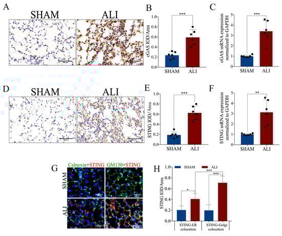 cGAS-STING expression is up-regulated in LPS-induced acute lung injury. (A) Representative images of immunohistochemical staining of cGAS (scale bar = 500 µm). (B) Statistics of the positive signal of cGAS in lung tissue. (C) cGAS mRNA expression in lung tissue. (D) Representative images of immunohistochemical staining of STING (scale bar = 500 µm). (E) Statistics of the positive signal of STING in lung tissue. (F) STING mRNA expression in lung tissue. (G) Representative images of immunofluorescence co-localization of calnexin (green) and STING (red), and GM130 (green) and STING (red) (scale bar = 50µm). (H) Fluorescence signal statistics of cGAS and STING located in the ER and Golgi. IOD = integral optical density. Data are presented as the mean ± SD, n = 6 per group. * p < 0.05, ** p < 0.01, *** p < 0.001. Comparisons between two groups were analyzed by an unpaired t test.