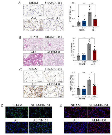 Having identified activation of the cGAS-STING pathway in LPS-induced ALI, we continued to explore whether cGAS-STING participates in the pathogenesis of ALI. H-151, an inhibitor of STING, was intraperitoneally injected into the ALI murine model and control. The increased expression of STING in the lung from the murine ALI model was reversed by the treatment with H-151, which indicated a successful blockade of the cGAS-STING pathway (Figure 5A). ZO-1 and E-cadherin are markers of intercellular junctions. Administration of H-151 alleviated pulmonary edema, hemorrhage, thickening of the alveolar septum and infiltration of inflammatory cells (Figure 5B); DNA damage in pulmonary tissue (Figure 5C); and disruption of intercellular junctions (Figure 5D,E) in LPS-induced ALI. Taken together, activation of cGAS-STING participated in the pathophysiological process of LPS-induced acute lung injury, and pharmacological blockade of cGAS-STING conferred protection against ALI.