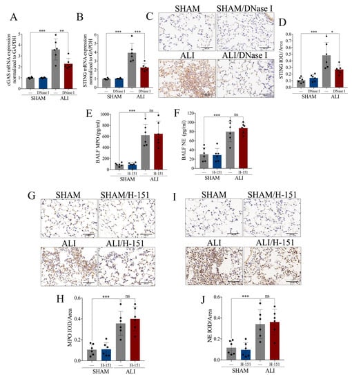 NETs induce acute lung injury via the cGAS-STING pathway. NETs inhibitor DNase I (20 mg/kg) was intravenously injected to degrade NETs. (A) mRNA expression of cGAS in lung tissue. (B) mRNA expression of STING in lung tissue. (C) Representative images of immunohistochemical staining of STING in lung tissue (Scale bar = 500 µm). (D) Statistics of the positive signal of STING in lung tissue. STING inhibitor H-151 (30 mg/kg) was intraperitoneally injected as a cGAS-STING blockade. (E) Concentration of MPO in BALF. (F) Concentration of NE in BALF. (G) Representative images of immunohistochemical staining of MPO in lung tissue (Scale bar = 500 µm). (H) Statistics of the positive signal of MPO in lung tissue. (I) Representative images of immunohistochemical staining of NE in lung tissue (Scale bar = 500 µm). (J) Statistics of the positive signal of NE in lung tissue. IOD = integral optical density; ns = no significance. Data are presented as the mean ± SD, n = 6 per group, * p < 0.05, ** p < 0.01, *** p < 0.001. Comparisons between two groups were analyzed by an unpaired t test; otherwise, one-way analysis of variance was performed, and Tukey’s test was used to perform pairwise comparisons.