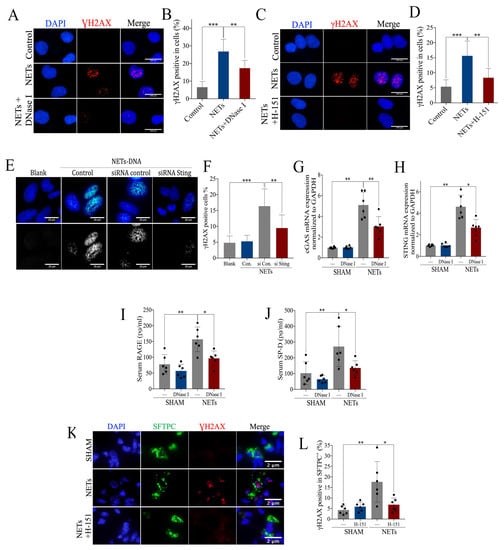 To further verify the effects of NETs on pulmonary epithelial cells, we first stimulated the bronchial epithelium transformed with Ad12-SV40 2B (BEAS-2B) with exogenous human-derived NETs (hNETs), and found that the percentage of γH2AX-positive BEAS-2B cells increased after stimulation with hNETs (Figure 7A–F). Moreover, we also found that DNA damage was enhanced in BEAS-2B cells after stimulation with hNETs, which was reversed in response to co-incubation with DNase I, further suggesting that hNETs induce DNA damage in pulmonary epithelial cells (Figure 7A,B). Furthermore, DNA damage in BEAS-2B cells induced by hNETs decreased significantly when BEAS-2B cells were co-incubated with STING inhibitor H-151 (Figure 7C,D) or STING was knocked down by small interfering RNA (Figure 7E,F), indicating hNETs induced pulmonary epithelial cellular DNA damage via cGAS-STING in vitro. Elevated mRNA expression of cGAS and STING was observed in mice receiving murine-derived NETs (mNETs) by intratracheal instillation, which was diminished by the administration of DNase I (Figure 7G,H), suggesting mNETs induced activation of cGAS-STING in vivo. Receptor of advanced glycation end products (RAGE) and surfactant protein-D (SP-D) are markers of airway injury [,,]. RAGE as well as SP-D (Figure 7I–J) and the percentage of γH2AX-positive SFTPC+ cells (Figure 7K,L) were increased in mice with exogenous mNETs, suggesting NETs induced epithelial cellular damage in vivo. Additionally, the blockade of cGAS-STING significantly alleviated the mNETs-induced DNA damage, as shown by the decreased percentage of γH2AX-positive SFTPC+ cells when the ALI model was treated with H-151 (Figure 7K,L). In summary, the hNETs intervention experiments in vitro and mNETs intervention experiments in vivo showed that NETs induce pulmonary epithelial cell damage via cGAS-STING.