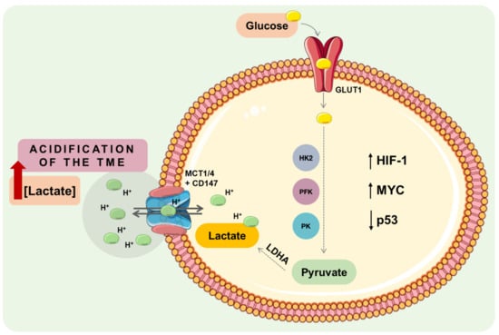 Deprivation of oxygen diffusion occurs upon tumour growth combined with impaired vascularisation. Thus, in response to these environmental changes, cells activate HIF-1 [,]. Additionally, the PI3K/Akt/mTOR pathway can stimulate HIF-1 upregulation. Key players in the glycolytic phenotype are consequently activated, such as glucose transporters (GLUTs), hexokinase 1 and 2 (HK1, HK2), phosphofructokinase (PFK) and pyruvate kinase (PK), lactate dehydrogenase A (LDHA) and MCTs. HK1 and HK2 are responsible for the first committed step of glycolysis (glucose phosphorylation); PFK and PK promote the reduction of glucose to pyruvate; LDHA leads to increased lactate production; and MCTs are the lactate extrusion transporters [,,,]. In turn, HIF-1 also upregulates pyruvate dehydrogenase kinases (PDKs) to prevent the transition of pyruvate to the TCA cycle. Increased accumulation of lactate at the TME promotes acidification, which stimulates HIF-1 upregulation independently of hypoxia []. Cancer metabolism is also influenced by the inactivation of tumour suppressor genes, such as p53, which narrow the use of mitochondrial respiration by downregulating the synthesis of cytochrome c oxidase (SCO2) gene [] (Figure 1).