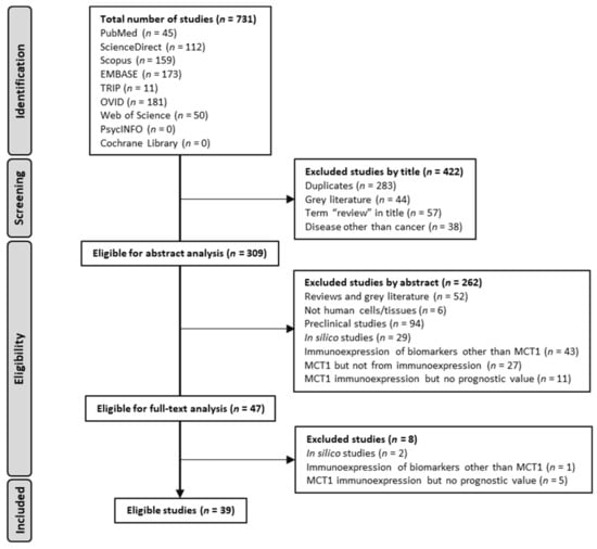 Eligible studies had to include human cancer patient samples (cohort studies) with an evaluation of MCT1 expression through IHC and its correlation with survival parameters. Furthermore, studies had to be written in the English language. Reports on preclinical studies–including in vitro experiments and in vivo primary studies, studies with MCT1 protein expression retrieved from databases, MCT1 gene expression-only evaluations (mRNA), grey literature, reviews and studies not written in English were excluded from this systematic review (Figure 2).