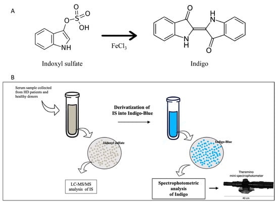 A multiresidue analysis by tandem MS was carried out in the estimation of the concentration of IS in the blood of both HD and the control group. Accordingly, the serum IS was derivatized by a rapid reaction in a stable chromophore called Indigo blue. The results of the chemical conversion of IS into Indigo were monitored by LC-MS/MS, demonstrating that the total amount of serum IS was completely converted into Indigo after 15 min. Ultimately, the total concentration of IS-derived Indigo was evaluated by using a smart UV-Vis spectrometer. Furthermore, we developed a smart device named “Theremino Spectrophotometer”, which can convert the absorbance level of Indigo (defined by the range of Indigo quantification from 10 mM to 400 mM in UV-VIS) in a concentration value of IS that can be digitally acquired and managed.