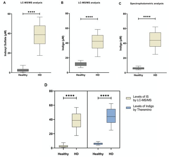 We implemented chemical derivatizations in order to transform the total amount of IS into Indigo blue in serum samples from HD patients and healthy donors. This method allowed a rapid quantification of IS-derived Indigo at λ = 420–450 nm by using the mini-spectrophotometer Theremino. Moreover, to address the method’s feasibility, we compared the levels of Indigo measured with Theremino to the levels of IS and Indigo measured with LC-MS/MS. Both the specificity and the repeatability of Indigo levels monitored by Theremino were strongly correlated to the standard method. Since numerous studies show that the serum IS levels of healthy subjects are <10 μM and >20 μM for HD patients, we considered that the linearity together with the LLQ was satisfactory for sample measurements. Furthermore, our method was not influenced by external agents or other uremic toxins such as pCS, demonstrating its high specificity for IS. In our analysis, the spectrophotometric method showed that Indigo’s intensity showed a 3-fold increase in the patient group compared to the baseline amount. Remarkably, this result was closely comparable to the LC-MS/MS analysis of IS and IS-derived Indigo before and after derivatization, respectively. According to these data, the new method based on the Theremino spectrophotometer is characterized by high sensitivity in discriminating the levels of IS (by Indigo) between healthy subjects and HD patients corresponding to the standard method. Moreover, we found that the serum amount of the total and free fraction of indoxyl sulfate was highly comparable between LC-MS/MS and Theremino. This result was in line with previous data showing a high albumin-binding ratio of 90% [52].
