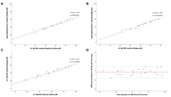 (A–C) Linear regression analysis of the relationship between the LC-MS/MS method and colorimetric assay performed using Theremino on IS and IS-derived Indigo in HD patients. (D) Evaluation of the agreement by the Bland–Altman plot using the difference and the mean among the data of the two methods. Upper and lower green lines represent the region of agreement, and the red line represents the bias between methods (−5.7732) obtained by the mean of the difference of results.